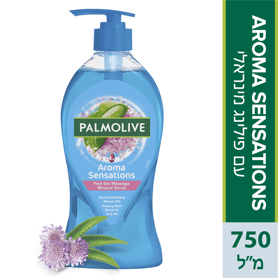 ג'ל רחצה פילינג מינרלי מבית פלמוליב (Aroma Sensations), אריזה 750 מ"ל. מיועד לניקוי וטיפוח העור עם אפקט פילינג עדין.